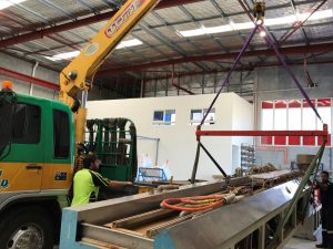 Green & Gold Hiab assisted with the move of this large Double Glazing Machine.